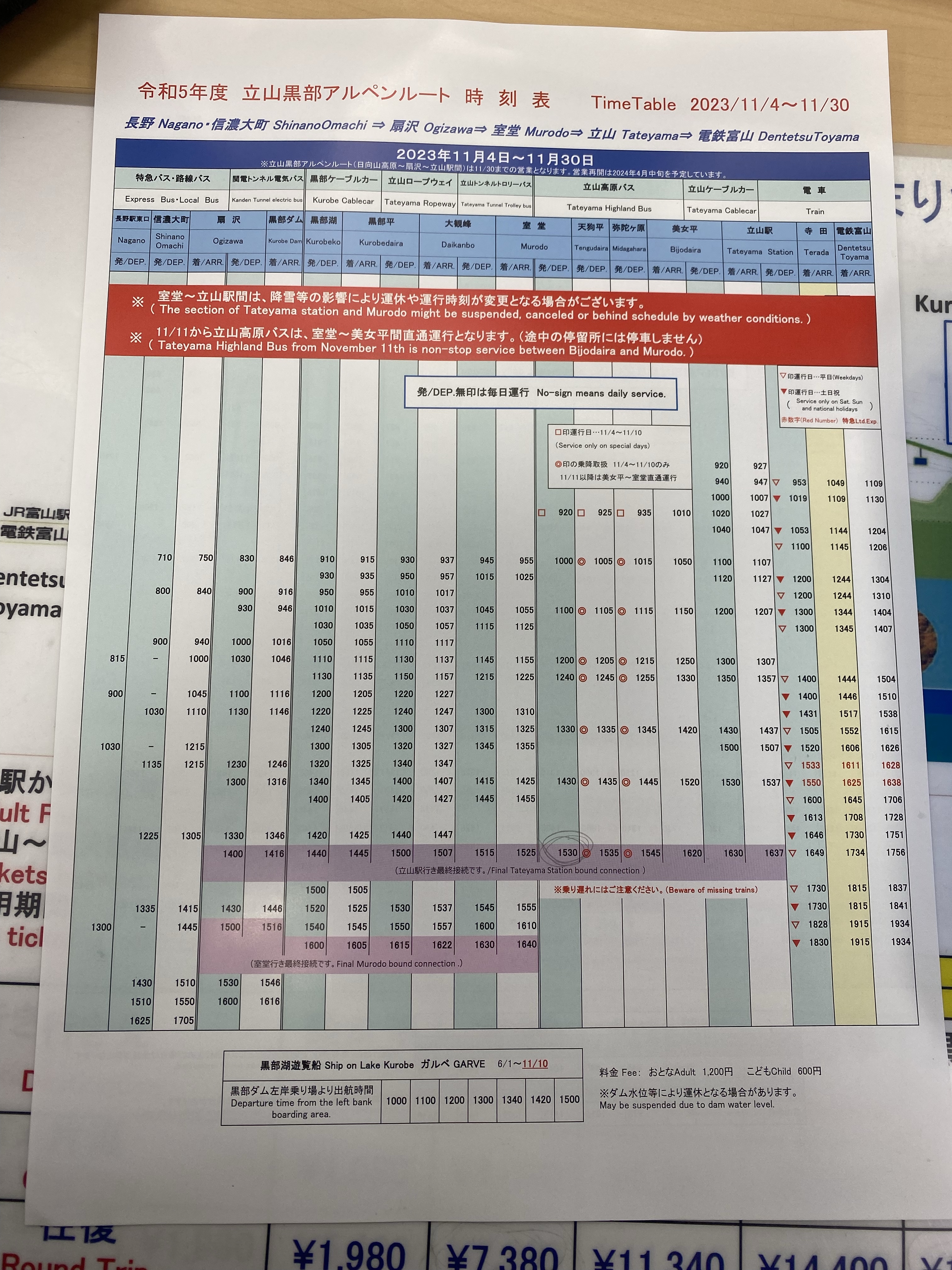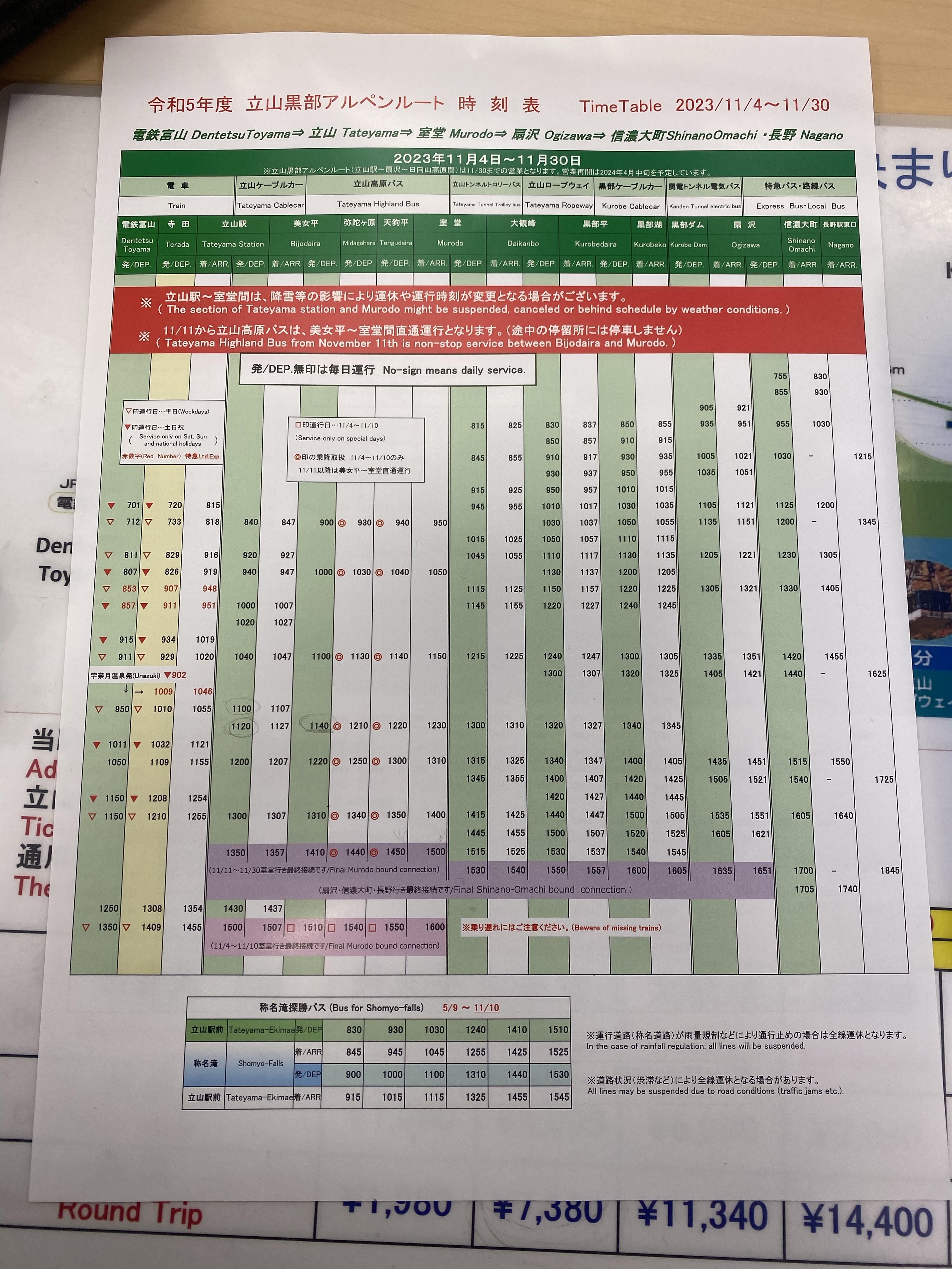 A: การเดินทางจากฝั่ง Tateyama ตั้งแต่ Bijodaira ไป Murodo จะต้องนั่งรถบัส Tateyama Highland Bus ซึ่งถ้าหิมะตกหนัก รถบัสจะวิ่งไม่ได้ ต้องเคลียหิมะก่อน ซึ่งมันจะคาดเดาไม่ได้เลยว่ารถบัสจะหยุดวิ่งนานเท่าไหร่หรือหยุดกี่วัน ตอนที่ไปคือมีพายุหิมะ รถบัสหยุดวิ่งทั้งวัน ซึ่งเป็นวันกลับ ดังนั้นเราจะกลับไป Tateyama ไม่ได้ ต้องกลับทาง Nagano เท่านั้น แล้วนั่ง Shinkansen ไป Toyama แล้วต่อรถไฟมาที่ Tateyama อีกที ซึ่งจะเดินทางนานมาก หลายต่อ มีค่าใช้จ่ายเพิ่มขึ้น ดังนั้นแนะนำว่า ถ้ามาเที่ยวช่วงฤดูหนาว มาเที่ยวเฉยๆ ไปจากฝั่ง Nagano จะดีกว่า แต่ถ้าต้องแบกของเยอะ มีสัมภาระ ไปจากฝั่ง Tateyama จะดีกว่า (แต่ต้องเสี่ยงดวงเรื่องพายุหิมะเอา) ควรเช็คสภาพอากาศตลอดนะคะ