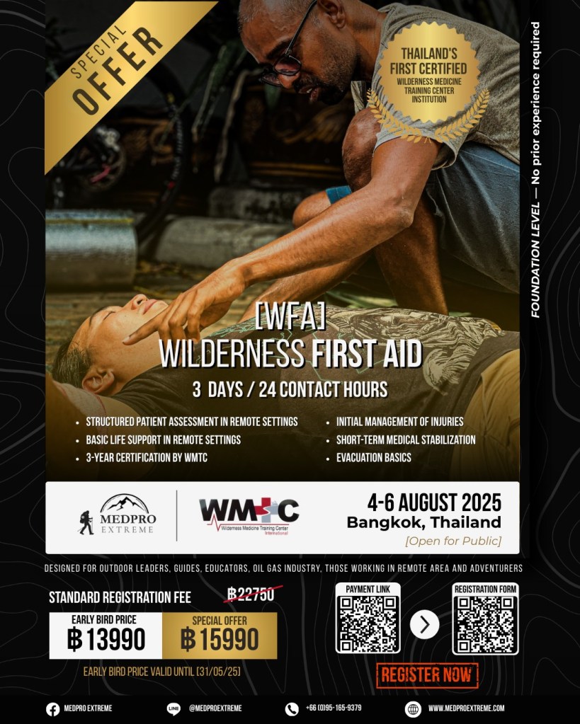 MedPro Extreme ภูมิใจที่จะเปิดหลักสูตรการแพทย์ฉุกเฉินในพื้นที่ห่างไกล (ระดับการปฐมพยาบาลพื้นฐาน) – (Wilderness First Aid – WFA) “การแพทย์ในถิ่นทุรกันดาร” https://medproextreme.com/wmtc-wfa