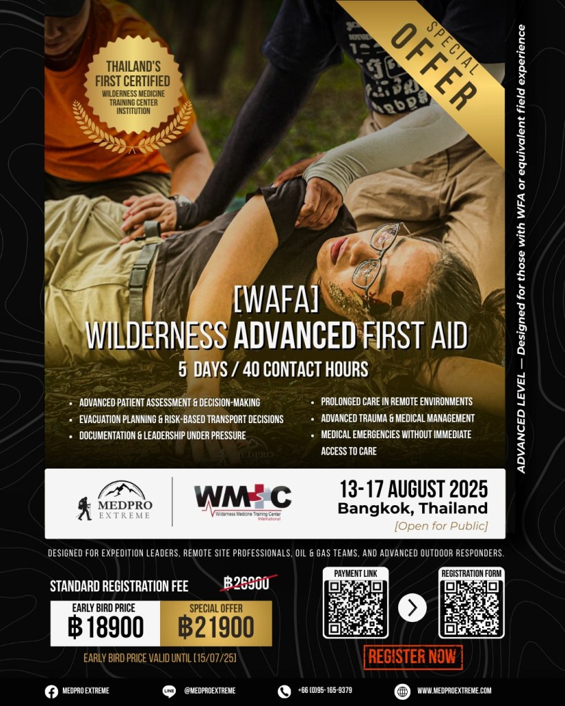 หากท่านยังไม่คุ้นเคยกับการแพทย์ในถิ่นทุรกันดาร แนะนำเริ่มต้นด้วยหลักสูตร WFA ของเรา (4–6 สิงหาคม) ก่อน