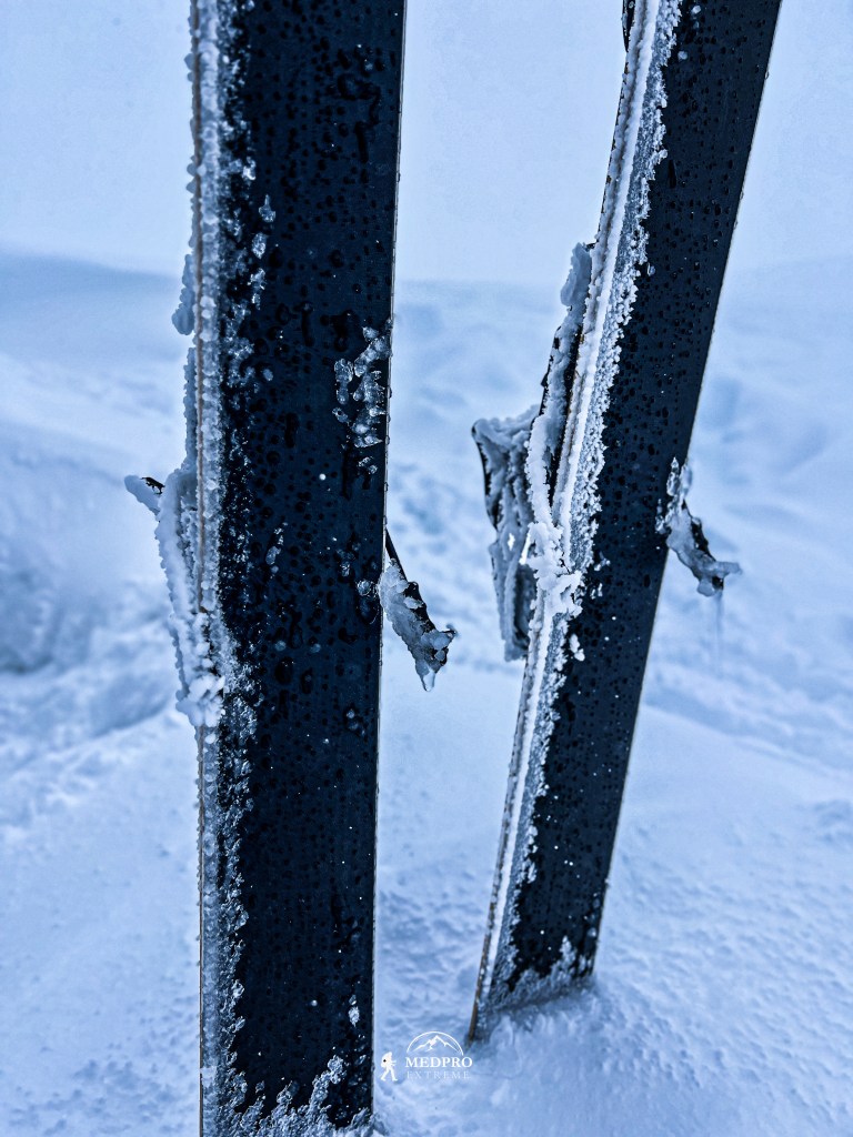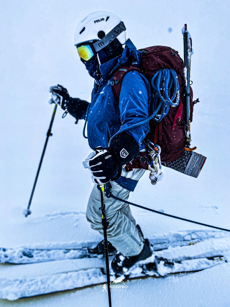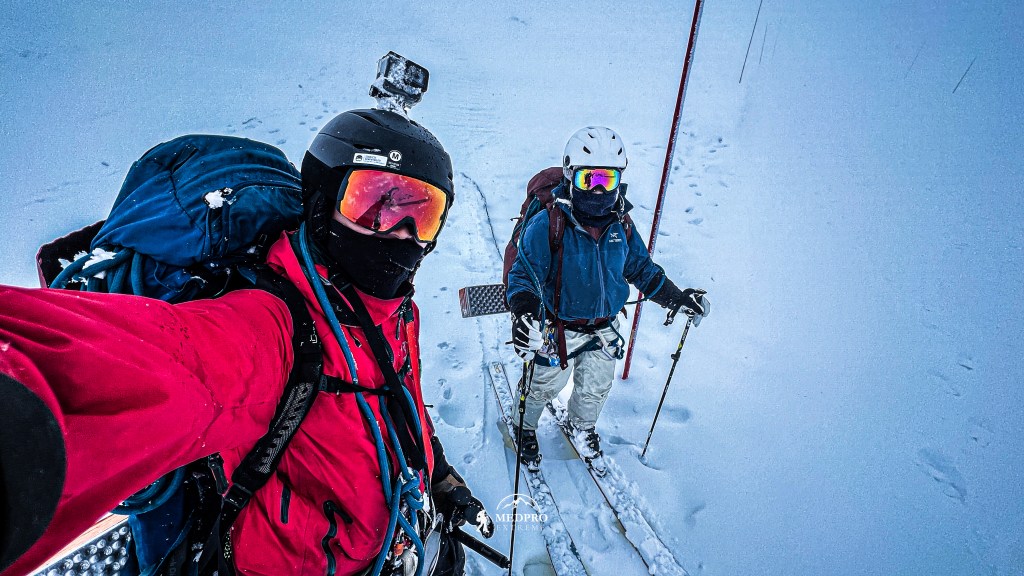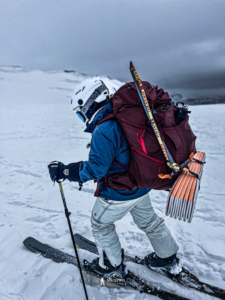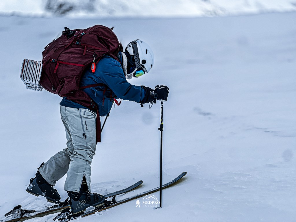 ในการพิชิตเส้นทางนี้ ใช้รองเท้า Mountaineering ธรรมดาไม่ได้ เพราะสภาพหิมะลึก 3-4 เมตร มันเดินไม่ได้เลย ! เพราะจมลึกถึงต้นขาในทุกย่างก้าว เราเคยต้องคลานในสภาพหิมะแบบนี้ด้วยซ้ำ เพราะฉะนั้น จำเป็นต้องใช้ Backcountry Ski Touring เท่านั้น มันคือ Ski ที่ออกแบบมาพิเศษให้สามารถเดินขึ้นเขาได้ (ปกติสกีจะไถลลงได้อย่างเดียว จะเดินขึ้นไม่ได้) การใช้สกีจะช่วยกระจายน้ำหนัก ทำให้เราไม่จมหิมะด้วย อีก Option หนึ่งที่ต้องมีคือ Skins ซึ่งเป็นแผ่นกาวแปะใต้สกี มีผิวขรุขระ ทำให้พื้นของสกียึดเกาะหิมะได้ เดินไต่ขึ้นเนินลาดชันได้ ความท้าทายของ Backcountry / Off piste ski คือหิมะจะฟูแบบธรรมชาติแท้ๆ บางทีอาจจะแข็งเป็นน้ำแข็ง มันจะไม่ได้ผ่านการ Grooming ด้วยรถปรับสภาพหิมะ (Snow Groomer) แบบในสกีรีสอร์ท ทำให้สกียากและมีความเสี่ยงต่อ Avalanche ด้วย