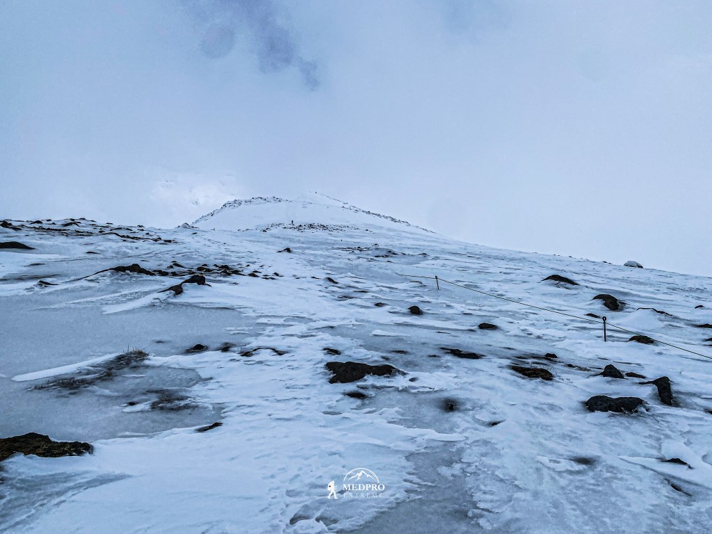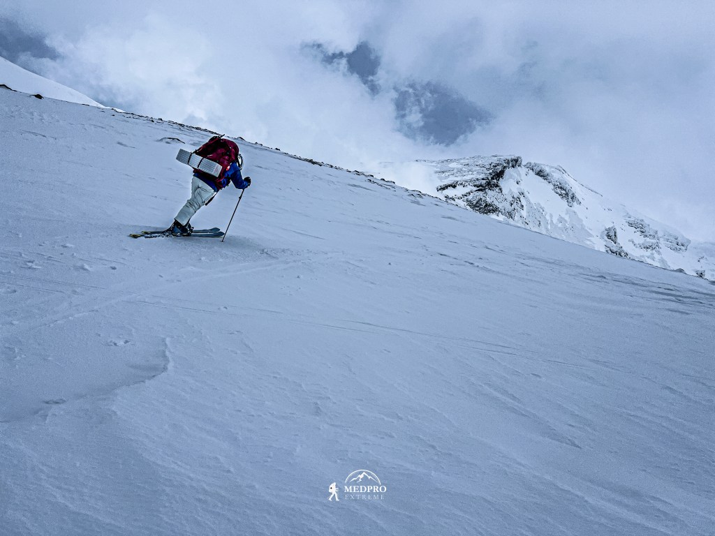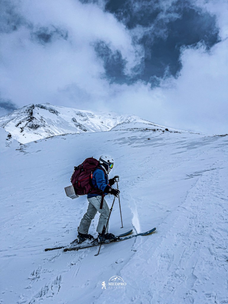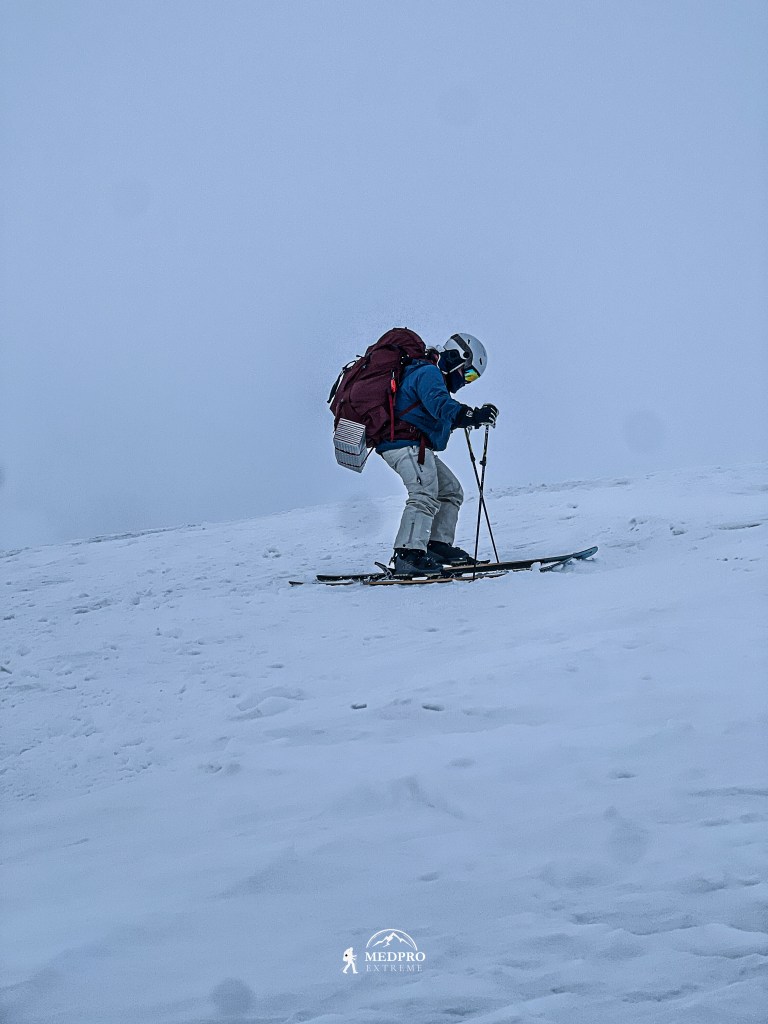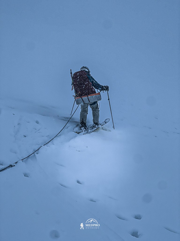 ในการพิชิตเส้นทางนี้ ใช้รองเท้า Mountaineering ธรรมดาไม่ได้ เพราะสภาพหิมะลึก 3-4 เมตร มันเดินไม่ได้เลย ! เพราะจมลึกถึงต้นขาในทุกย่างก้าว เราเคยต้องคลานในสภาพหิมะแบบนี้ด้วยซ้ำ เพราะฉะนั้น จำเป็นต้องใช้ Backcountry Ski Touring เท่านั้น มันคือ Ski ที่ออกแบบมาพิเศษให้สามารถเดินขึ้นเขาได้ (ปกติสกีจะไถลลงได้อย่างเดียว จะเดินขึ้นไม่ได้) การใช้สกีจะช่วยกระจายน้ำหนัก ทำให้เราไม่จมหิมะด้วย อีก Option หนึ่งที่ต้องมีคือ Skins ซึ่งเป็นแผ่นกาวแปะใต้สกี มีผิวขรุขระ ทำให้พื้นของสกียึดเกาะหิมะได้ เดินไต่ขึ้นเนินลาดชันได้ ความท้าทายของ Backcountry / Off piste ski คือหิมะจะฟูแบบธรรมชาติแท้ๆ บางทีอาจจะแข็งเป็นน้ำแข็ง มันจะไม่ได้ผ่านการ Grooming ด้วยรถปรับสภาพหิมะ (Snow Groomer) แบบในสกีรีสอร์ท ทำให้สกียากและมีความเสี่ยงต่อ Avalanche ด้วย