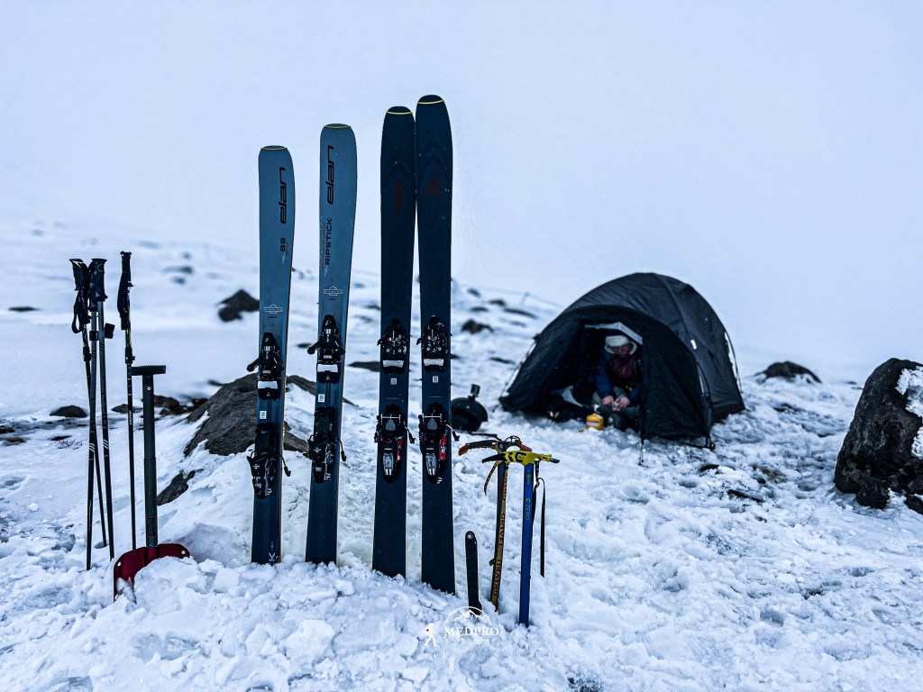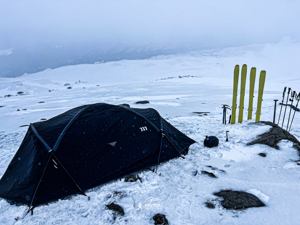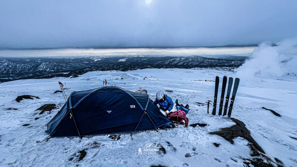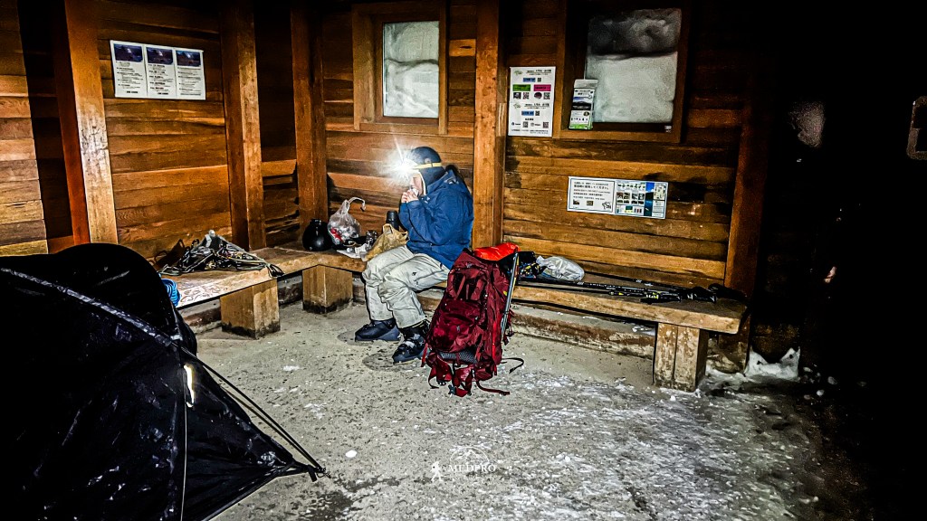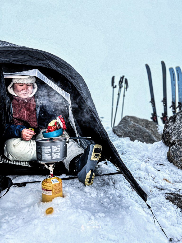 เราเดินกันหลายชั่วโมงจนถึงจุดที่ตั้งแคมป์ ดีใจมากกกกกกที่ได้วางเป้ลง คือหนักมาก เราปลดสกีออก รีบกางเต้นท์ จากนั้นต้มมาม่า กินข้าวปั้นและโมจิไส้ถั่วแดง เวลาหนาวๆ การได้กินอะไรอุ่นๆ เป็นอะไรที่ฟินมาก ตอนกลางคืนอากาศหนาวขึ้นอย่างชัดเจน น่าจะ -10 มีลมเล็กน้อย แต่โชคดีที่เรามี 4 Season Tent และถุงนอนที่เตรียมไว้ เลยหลับได้
