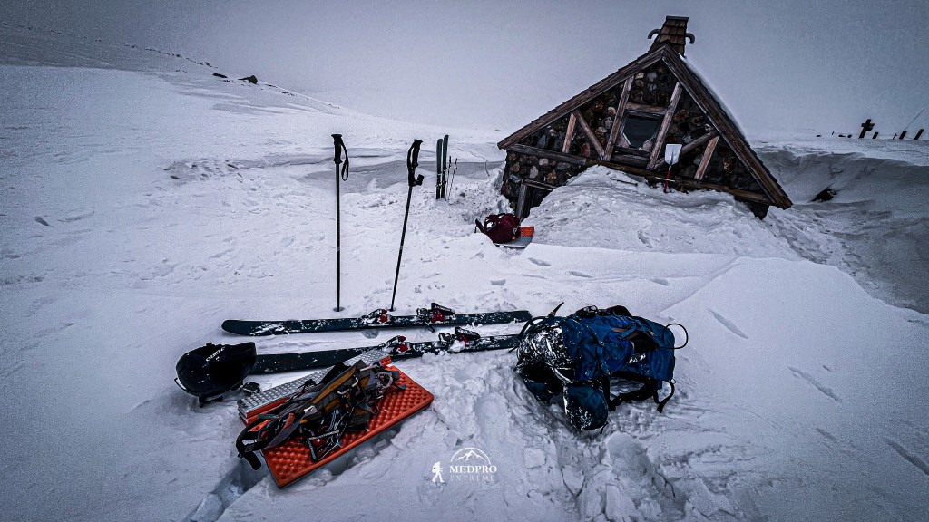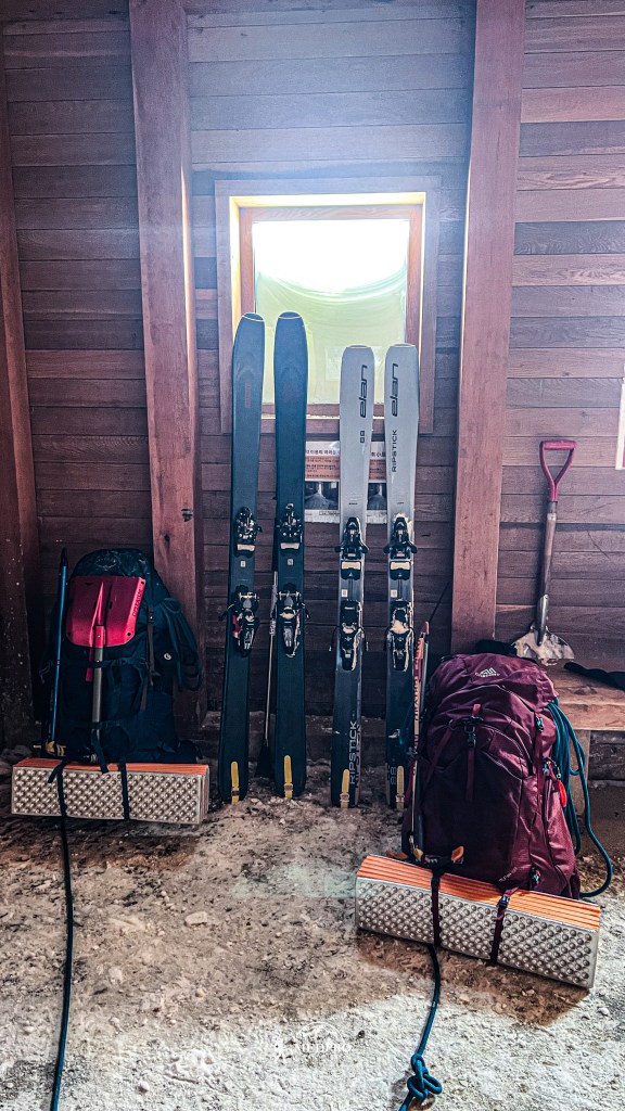 เราเอาสกีไปปักนอก Hut เพื่อเป็นสัญญาณบอกคนอื่นว่ามีคนพักอยู่ในนี้นะ เราลงทะเบียนกับแจ้งแผนการเดินทางไว้กับทางอุทยาน เราต้องอยู่ต่ออีกคืน ดังนั้นควรทำ marking ไว้ว่าเราปลอดภัยดี ไม่ได้ตกอยู่ในอันตรายหรือต้องการความช่วยเหลือ