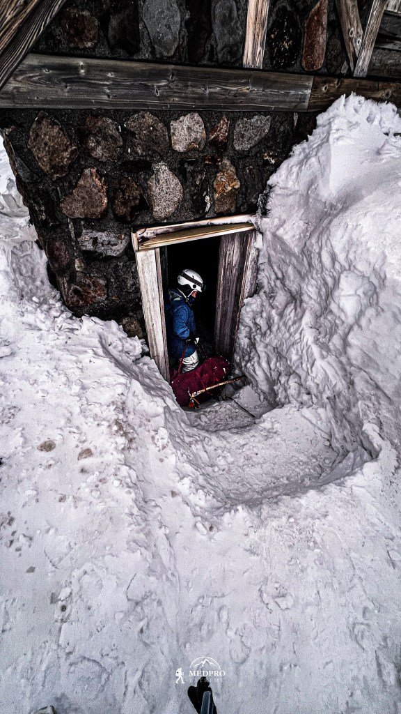 การ Rope up คือการผูกเชือกร่วมกันกับ Buddy เป็นทีม เป็นเทคนิคความปลอดภัยที่ใช้เวลาเดินทางบนภูเขาที่มีทัศนวิสัยเป็นศูนย์ การสกีลงไปในสภาพนี้ค่อนข้างเสี่ยง ซ้ายขวาเป็นเหว พลาดไปอาจจะหลงทาง ตกผา หล่นไปใน Crevasse ก็ได้ เรานำทางโดยใช้ GPS ใช้เวลาค่อยๆ ลง ลำบากกันหลายชั่วโมง แต่เพื่อความปลอดภัย แม้ว่าจะใช้เวลานานกว่าที่แพลนไว้ก็ตาม จนในที่สุดก็ถึง Emergency Hut เป็นกระท่อมที่ทางอุทยานจัดเตรียมไว้สำหรับนักเดินป่าที่ประสบปัญหาหรือหลบภัยจากสภาพอากาศที่อันตราย (เช่นพวกเราเป็นต้น)