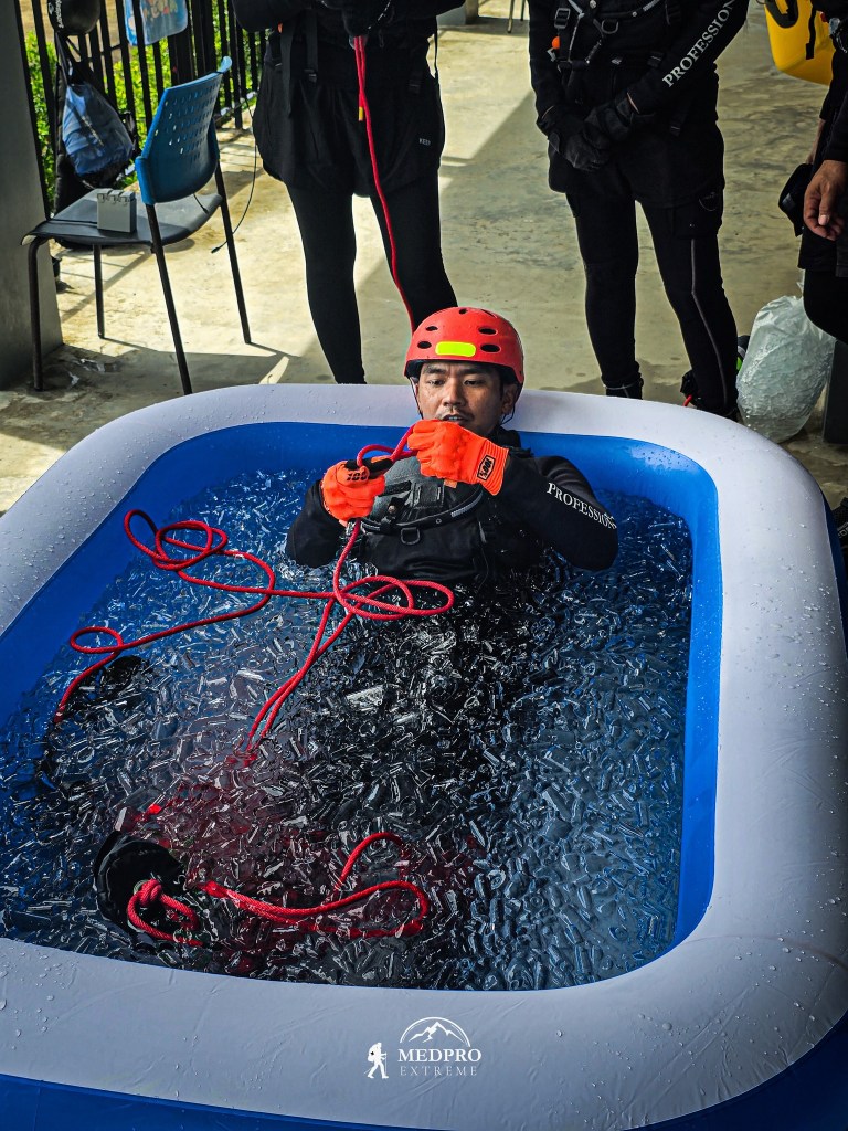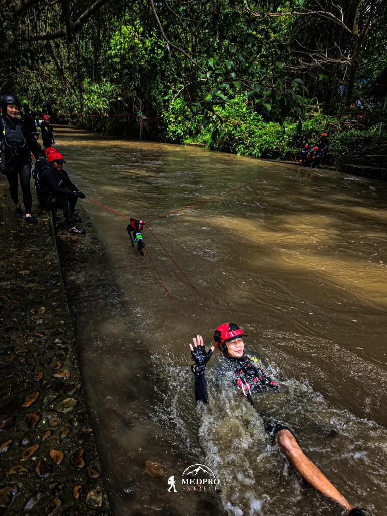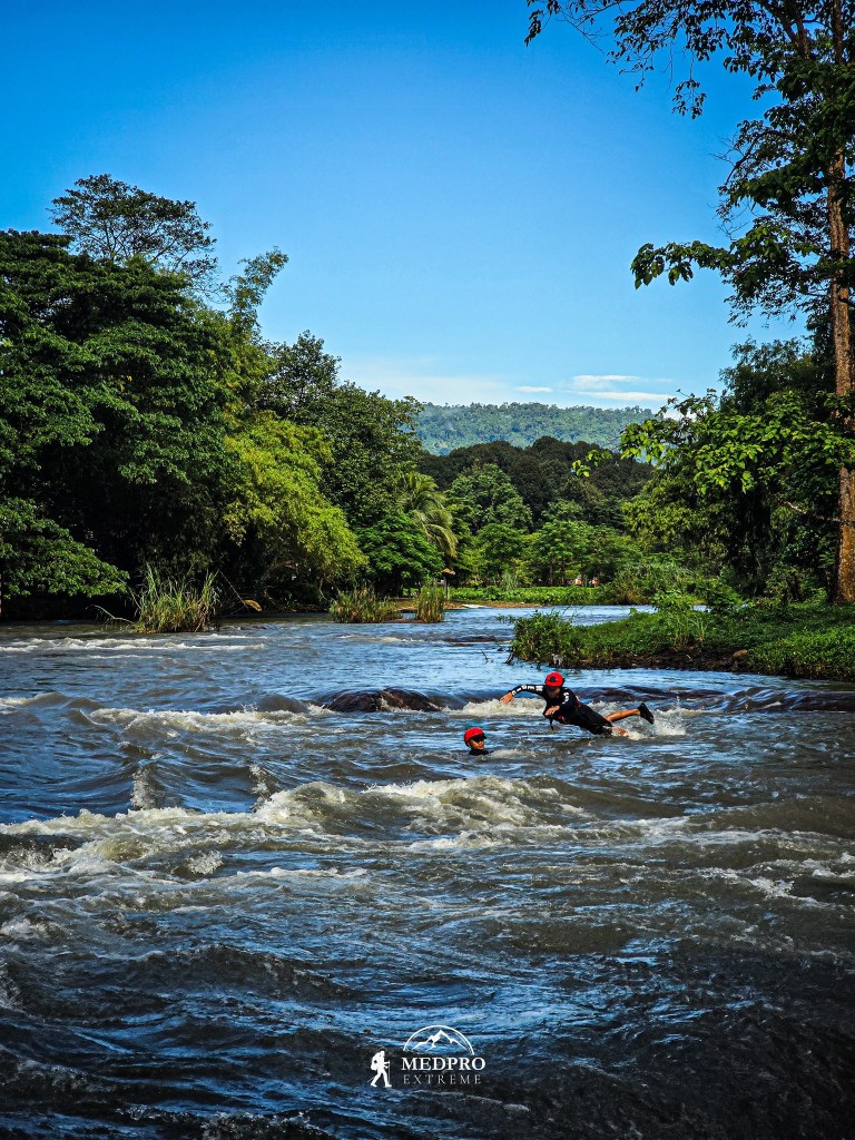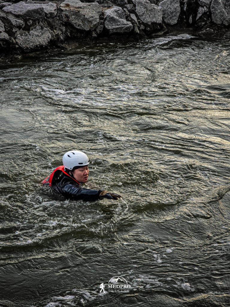 ใน Swiftwater Rescue เราต้องสามารถที่จะเอาชีวิตรอดในกระแสน้ำได้ อ่านน้ำเป็น เข้าใจ Hydrology เข้า Eddie ได้ ซึ่งนั่นก็เป็นเหตุผลให้เราต้องฝึกฝนการว่ายน้ำในกระแสน้ำ แต่ปัญหาที่พบคือ การมีภาพจำในการโดดน้ำก่อน ทำให้เรามีแนวโน้มที่จะเลือกวิธีการช่วยเหลือที่เสี่ยงที่สุด แทนวิธีที่ปลอดภัยที่สุด “Reach – Throw – Row – Go” ก่อนจะ Go ควรจะประเมินภาพรวมก่อน เพราะการโดดลงไปเป็นสิ่งที่อันตรายที่สุด ถ้าจำเป็นต้องทำ ควรมี Backup เช่น Upstream Spotter, Downstream Safety, Rope Tether, Backup Plan A, B, C